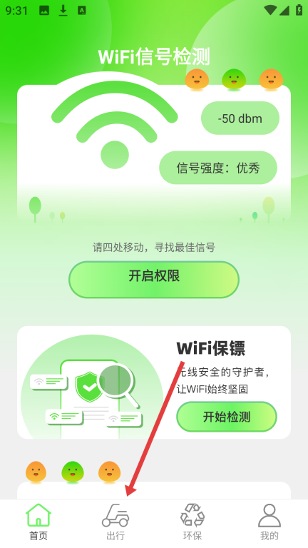 1、在WiFi信号检测页面点击底部【出行】,进入绿洲出行页面。