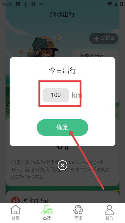3、在今日出行弹窗输入100km后点击【确定】,记录出行数据。