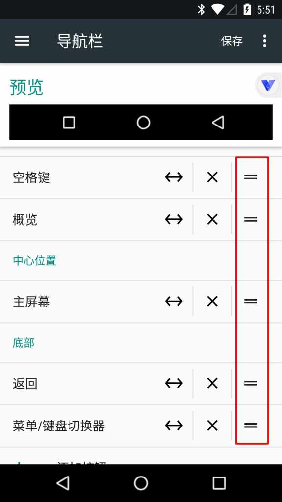 3. 点击导航栏进入设置界面,长按右侧的=号按钮并上下拖动以调整其位置。如下图所示,将主流返回按钮布局在右侧。请注意,六个位置的顺序必须与下图一致。调整完毕后,点击保存即可。