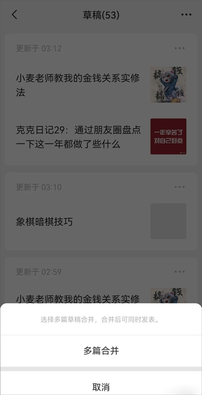 2、当你把多篇文章写完之后,全部存草稿之后,然后选择多篇合并。