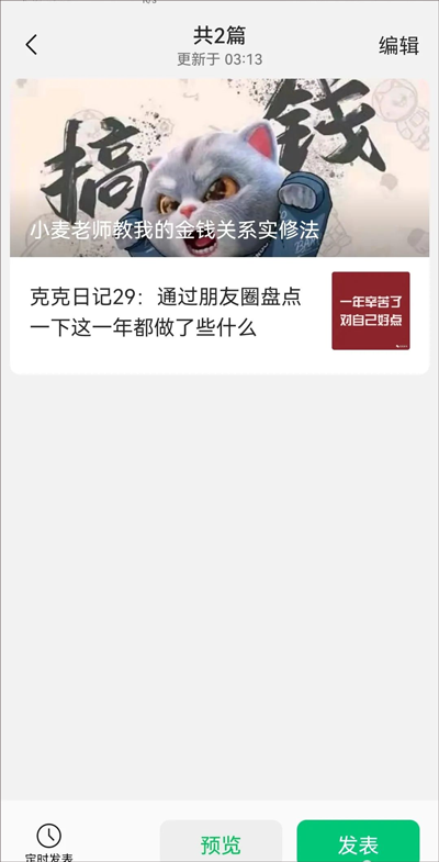 ●注意:设置“定时发表”后不可修改,但可取消,取消后不再占用群发条数,内容将恢复至草稿箱。