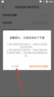 4、最后,在温馨提示的弹窗中点击【去注销】,并按照指引完成账号注销。