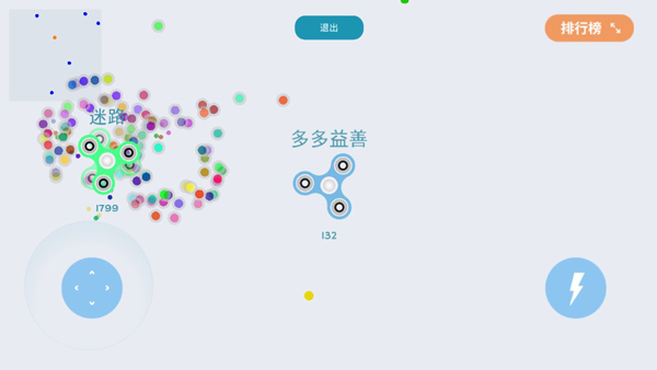 陀螺大作战的主要玩法还是大怼小,小怼小小,以此类推,玩家可凭借蛇皮走位尽快发育,正面硬刚可不是什么硬道理,前期主要发育点是吸收更多的彩色能力点,俗话说“猥琐发育,别浪”,放在这里再合适不过。悄咪咪的一点一点的吸波能量,只要旋转速度够快,那就差不多了,就可以撤了,蛰伏一边,等两败俱伤之势再出奇制胜。