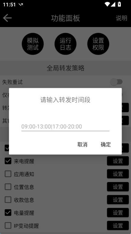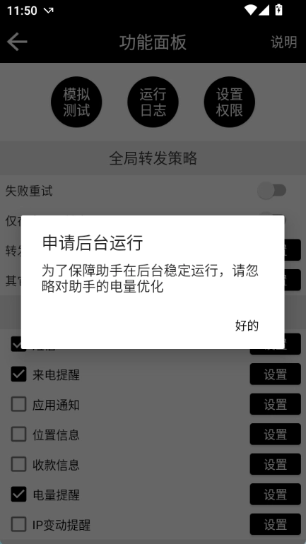 为确保转发功能能够正常运行,烦请开启对应的权限;对于不需要的功能权限(像定位、悬浮提示之类),您可以自行选择关闭。
