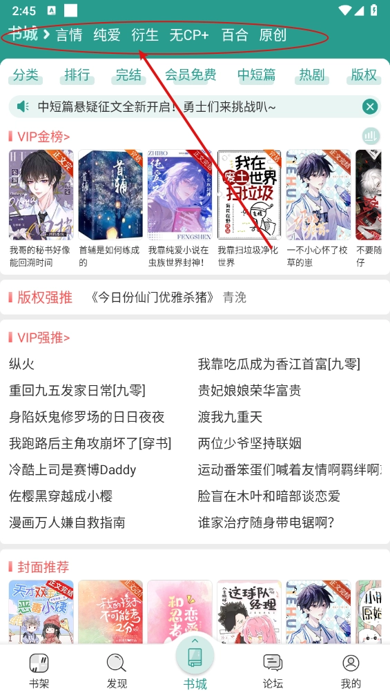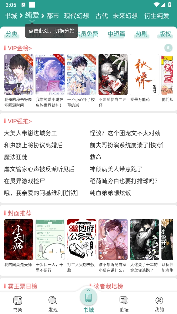 进入"书城"板块,涵盖了多个分类的小说资源。