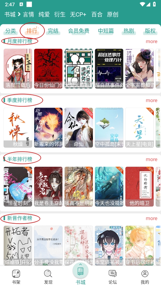进入“发现”页面,就像图中展示的那样,你可以依据不同的分类来查找自己喜欢的小说资源。