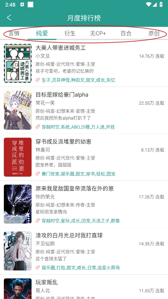比如进入“月度”排行榜,就能知晓各类题材的榜单详情。