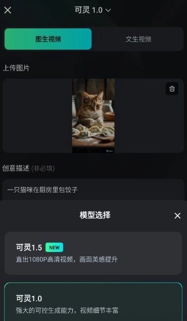 回到首页后,找到并点击AI视频功能入口,接着上传刚才准备好的图片,在提示词输入框中填写相关内容,随后点击“立即生成”按钮。生成时可以选择5秒或10秒的视频时长,若想缩短生成时间,建议选择可灵1.0模式。