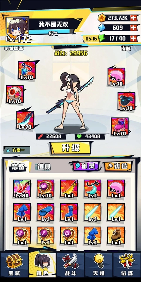 武器系统里每把刀都有独特之处,无论是基础升级还是彩装强化都很实用。白刀在金币关卡的表现堪称一绝,一个无双就能横扫五个敌人,老玩家都懂它的厉害。血刀在前期爬塔时优势明显,只要不被怪物秒杀,就能凭借持续伤害慢慢磨死对手。黑刀的无双技能冷却快、伤害高,还能享受暴击、爆伤、奥伤等多重加成,甚至可以打断Boss的技能;不过它的前摇较长,对付灵活的怪物时会有些吃力。到了后期装备成型后,黄刀和绿刀也能发挥出不错的实力。而赤影则是当前版本中获取难度最高的武器。