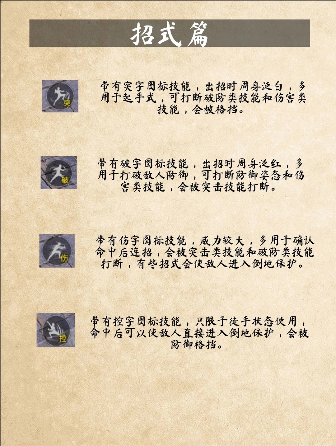 在《武侠乂》的战斗体系中,突击招式可克制破防招式与伤害招式;破防招式则对格挡状态和伤害招式具有克制效果;格挡状态能够防御突击招式和伤害招式的攻击;而控制招式无法对处于格挡状态的目标生效。