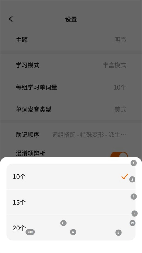 在设置菜单中,点击【每组学习单词量】