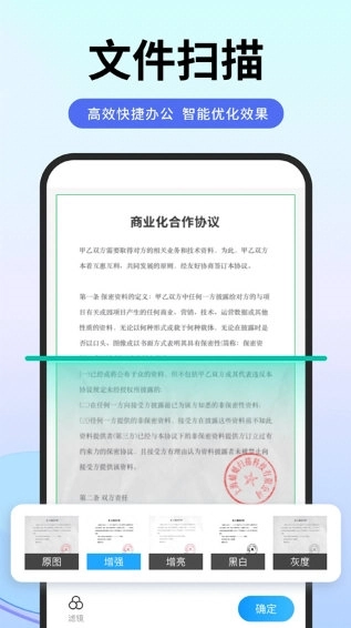 高清文档扫描:具备专业级图像处理能力,可智能去除杂乱背景,有效提升文档清晰度,支持一键导出PDF或JPG格式,助力办公更高效便捷。