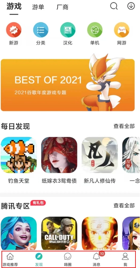 底部设有“游戏推荐”“发现”“嗨圈”“消息”和“我的”这些板块。
