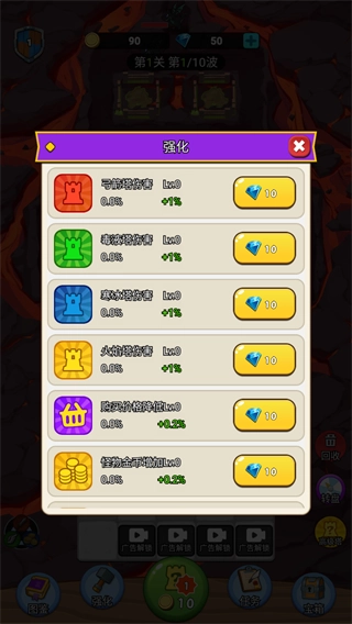 使用收集到的钻石,提升各类防御塔的攻击强度。无论是弓箭塔、毒液塔还是寒冰塔,多样的选择带来了无穷的策略空间。需要注意的是,战场上防御塔的部署位置数量有限,进行合理规划十分关键。