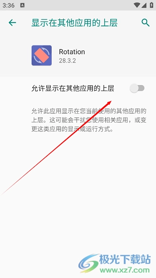 此时会跳转至一个窗口,把“允许显示在其他应用上层”右侧的开关按钮开启。
