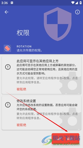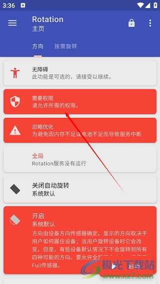 首先打开手机里的游戏,接着打开rotation软件,进入首页后,点击“需要权限”选项,开启对应的权限。