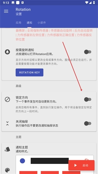 在通知设置中,找到锁定方向的选项,点击对应的开关把它打开。
