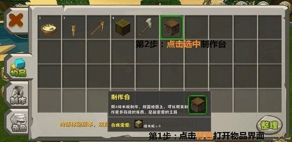 制作台是合成道具必不可少的工具,差不多所有道具的制作都离不开它。因此,我们得先动手做一个制作台。