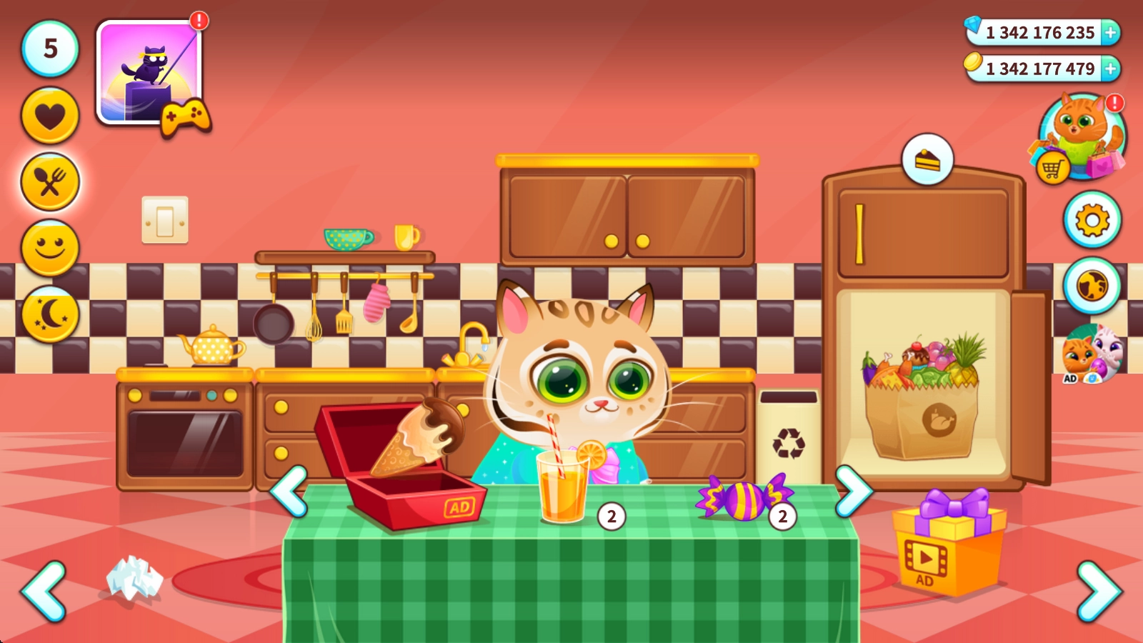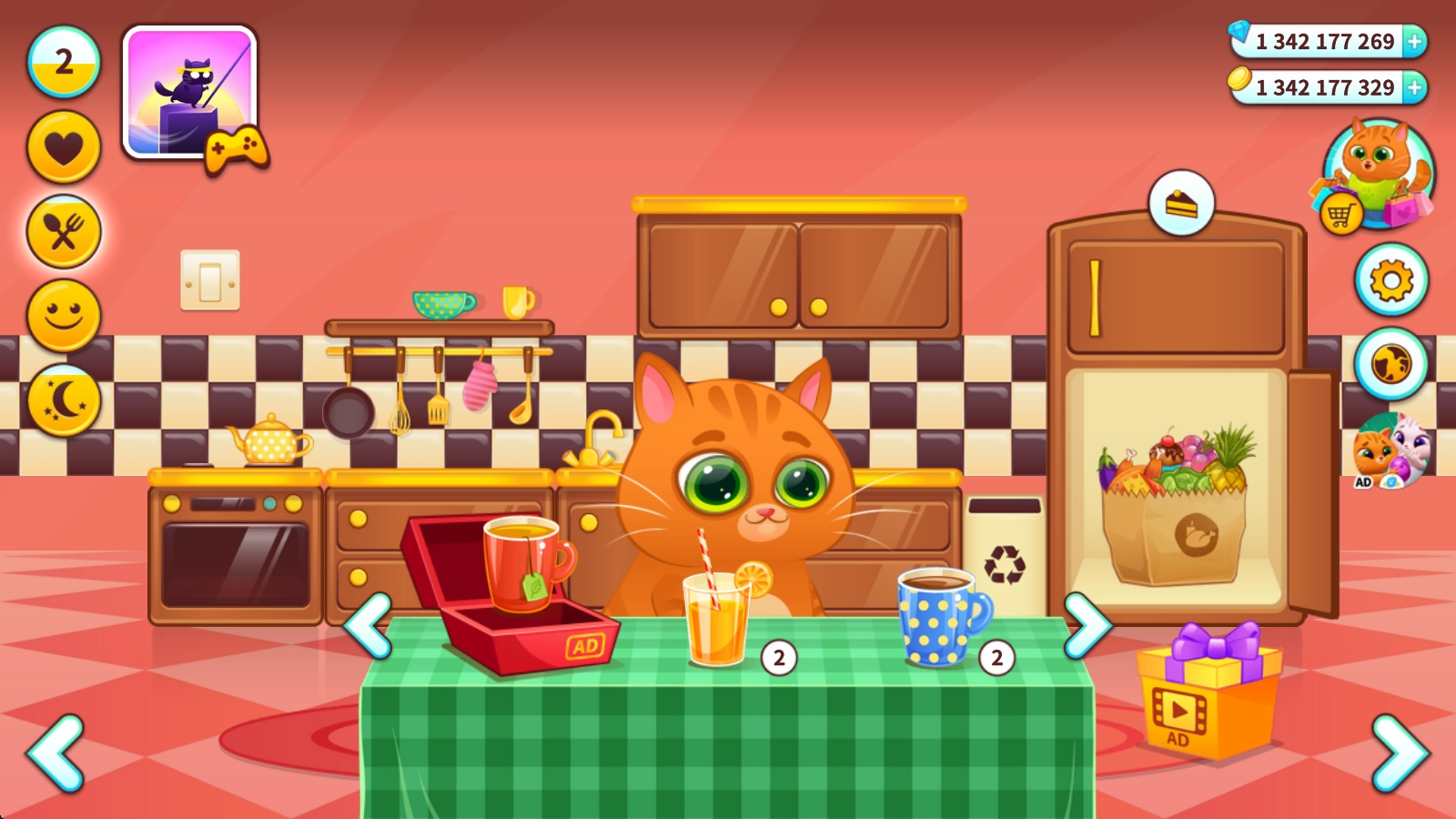 当猫咪的饱食度下降时,你可以前往厨房,为它准备并投喂各类美味的食物。