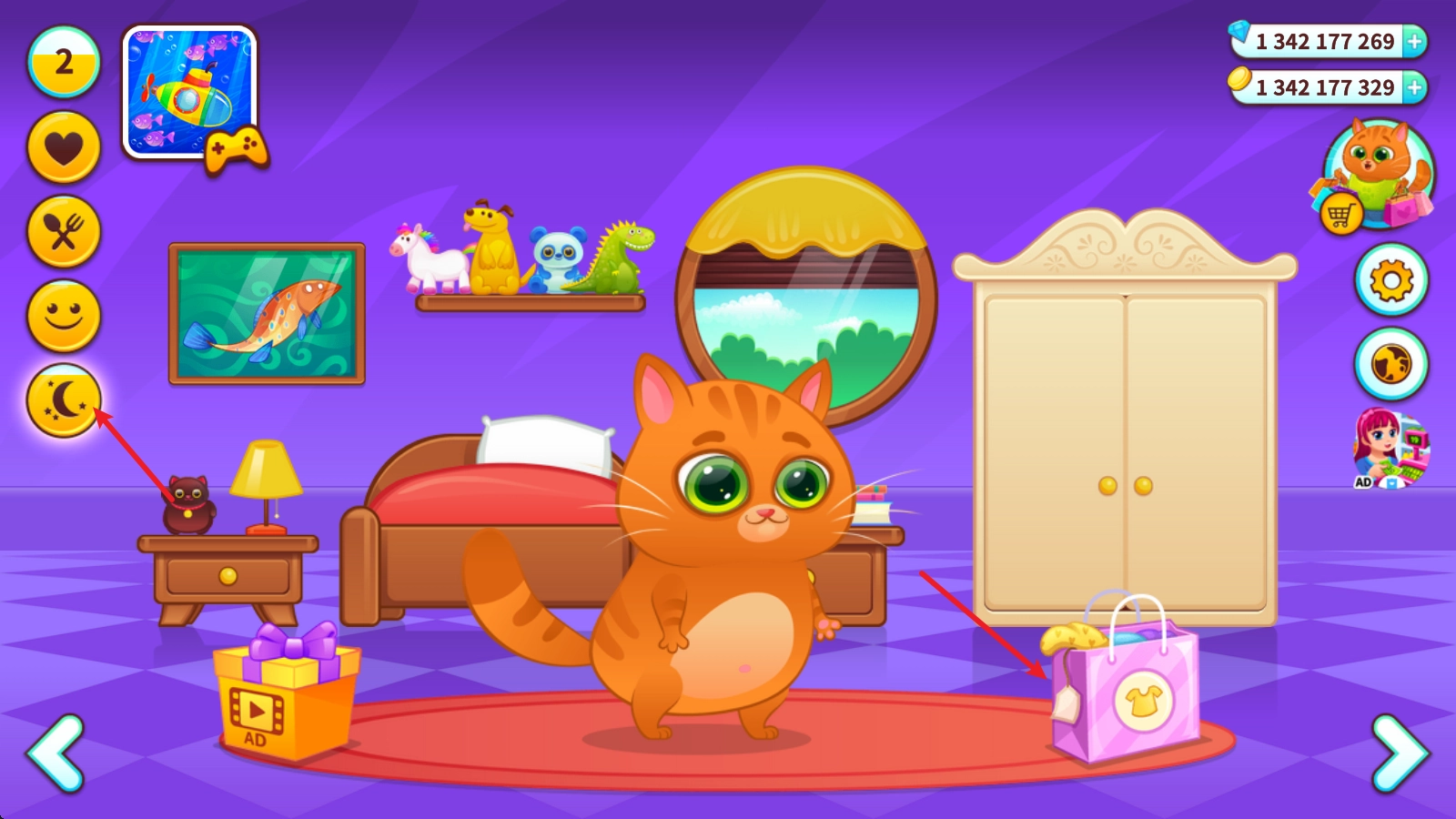 点击左边的月亮图标,就能直接进入猫咪的卧室,在这个房间里点击右侧的服装袋。