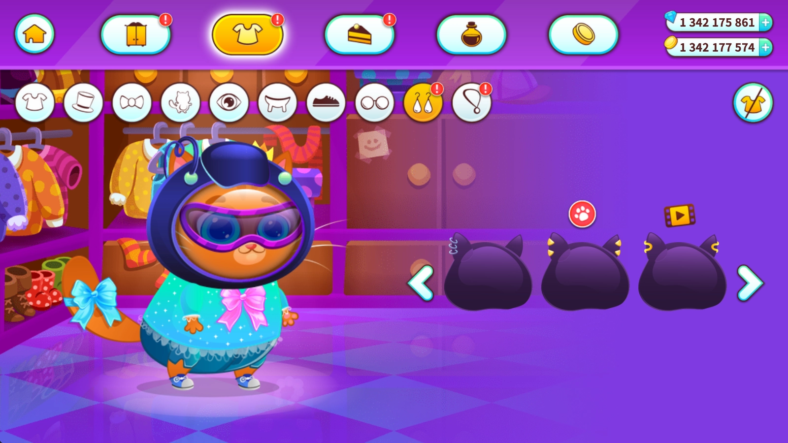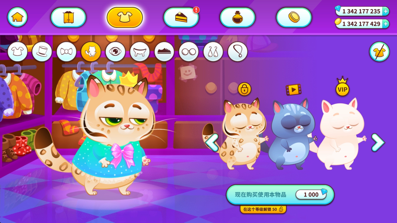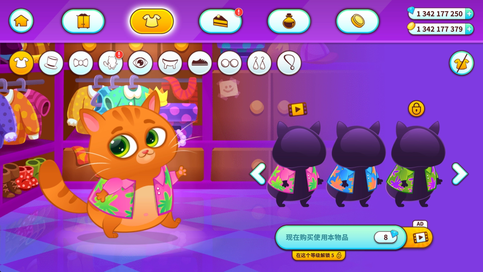 在这里可以挑选各种服装为猫咪打扮,部分服装需要一定等级解锁,也可以直接用钻石购买。