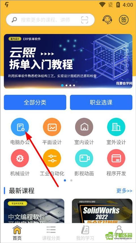 登录后进入首页,首页包含部分课程分类、职业选课以及最新课程等板块,接着点击想要购买的课程所属分类。