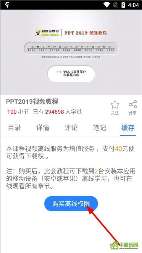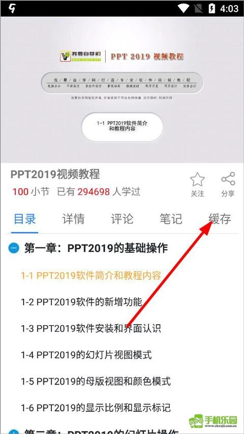进入课程页面后,能看到课程目录、详情介绍、相关评论以及缓存等功能板块,接着点击缓存按钮即可。
