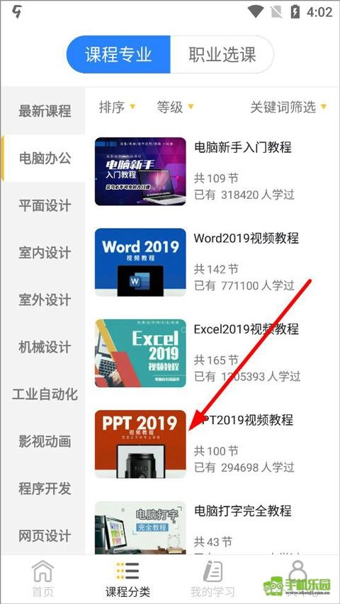 进入课程分类页面后,能看到电脑办公、平面设计、室内设计、工业自动化、程序开发等课程类目,接着点击PPT2019视频教程即可。