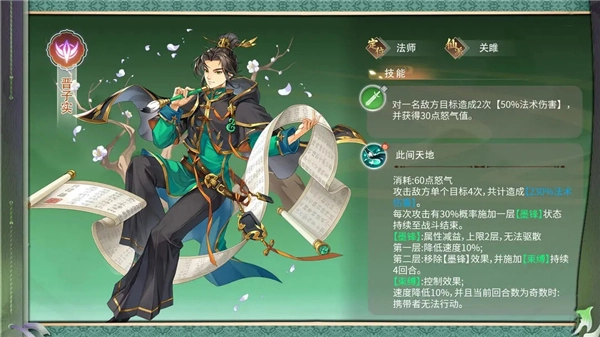 晋子实的定位是阴属性的法师,来自于仙派关雎。