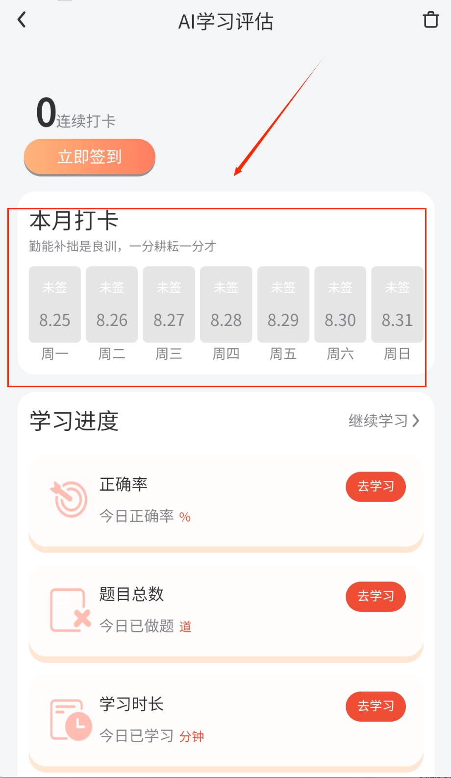 保存学习计划后,系统会自动生成可视化的日历视图,每天推送学习任务提醒,同时详细记录每个任务的完成情况。