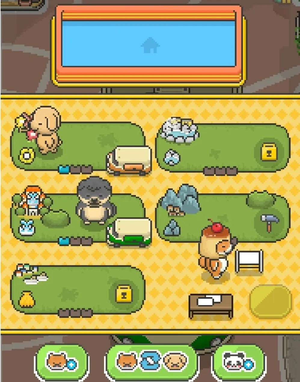 温馨的像素风游戏画面,各种Q版可爱的动物形象。
