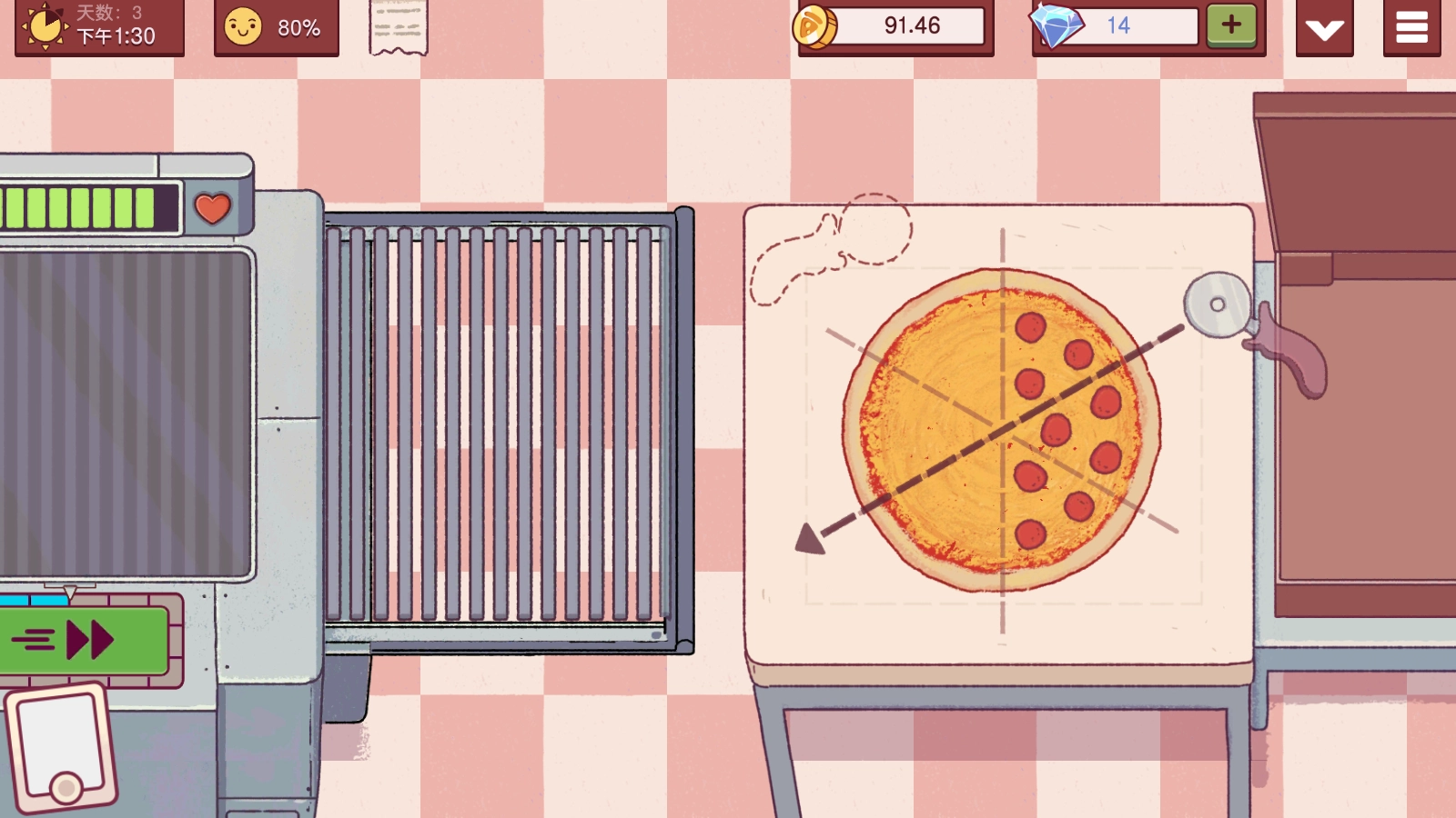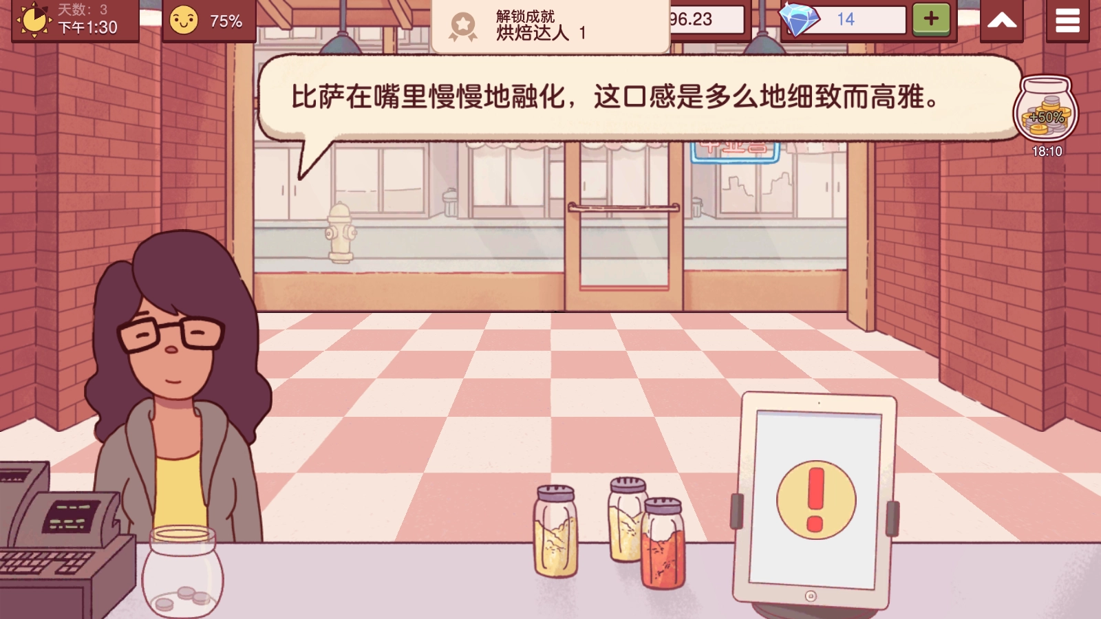 游戏本身没有特别惊艳的亮点,但恰恰是这种朴实的模拟经营玩法,反而更显真实有趣。从细致的披萨制作流程,到爱唠叨的顾客、爱讥讽我们的竞争对手,这些看似平平无奇的元素共同构成了游戏的核心。游戏用新闻播报来衔接次日的开启,这个设计颇具巧思——玩家既可以选择看广告换钻石,也能直接跳过进入新一天。剧情走的是日常路线,没有激烈的冲突,只有小镇居民间的日常拌嘴,让故事更具真实感;顾客间的小矛盾还常常能不经意逗乐玩家,为游戏添了份轻松的趣味。此外,玩家能用钱币提升制作效率、增加收入,这一设定也让游戏体验更便捷顺畅。
