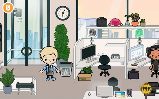 我们随意点击一栋大楼就能进入内部,比如选一栋商业楼宇,进去后会看到里面是一间办公室,能瞧见不少办公用品,还有许多正在工作的人员。