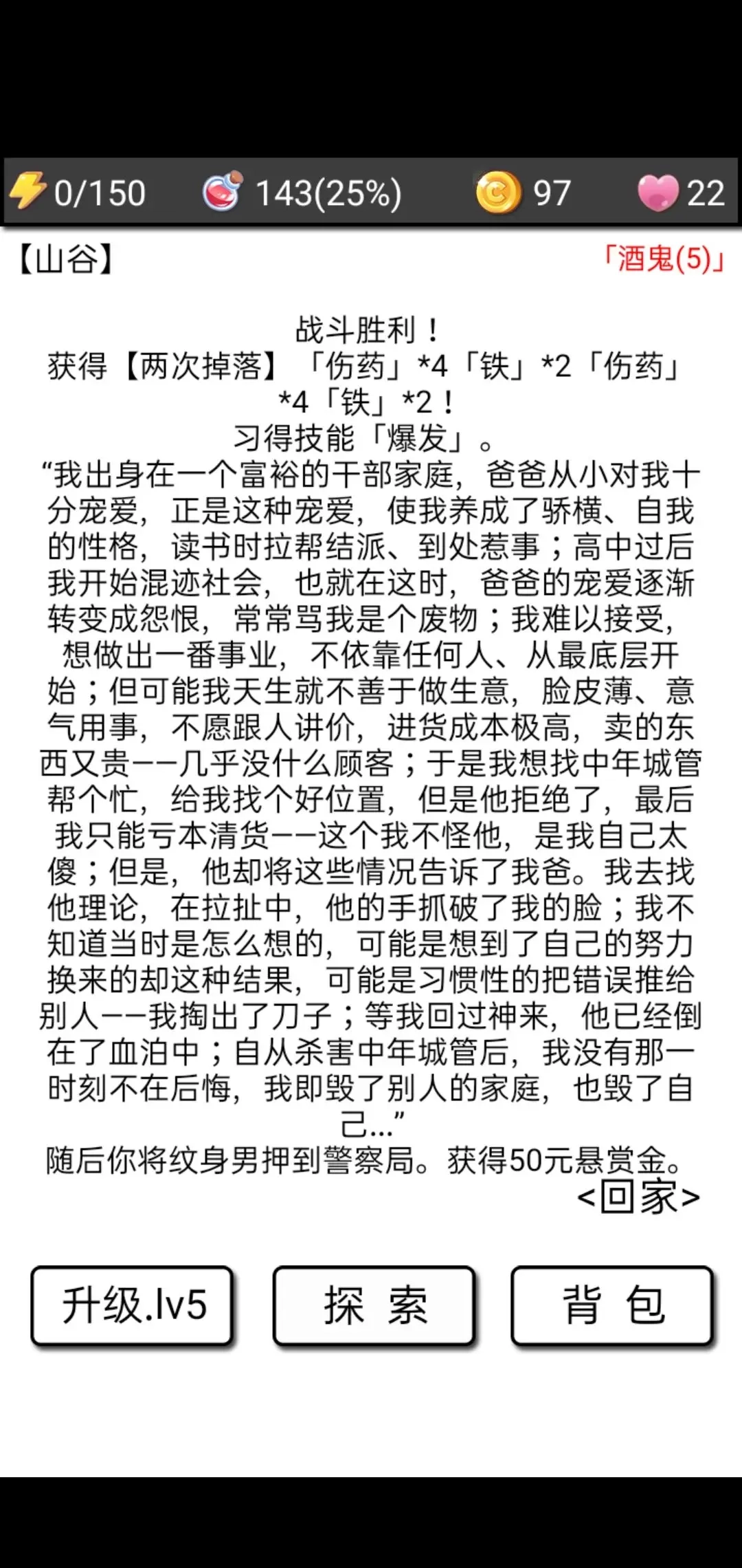 第四件事是有个大汉会找你要2块钱(你可以选择打他,大汉有几率掉落铁块,而且战斗时他可能会摔跤掉出草药;要是你多次给他钱,他还会带你找到一只超厉害的神秘巨兽,那家伙有1000多血——不过只要你能打得过纹身男,说不定也能打得过这只巨兽)。我等下会发山谷里的怪物信息,肥料能强化地图里的怪物,但对应的探索奖励也很丰厚。