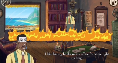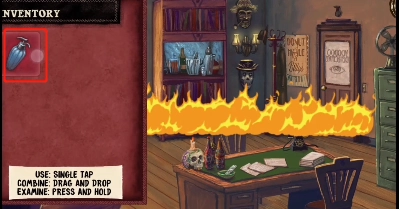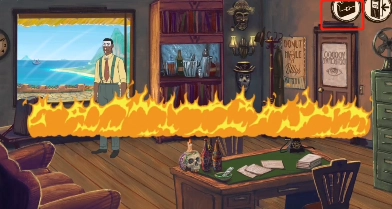 持续点击对话框,直至对话全部结束。之后你会看到“Voodoo Detective”字样起火,无需慌张,先检查墙上的两幅面具(两幅都要查看),再检查书柜的中间区域——这里藏着一个机关,打开后取出里面的喷水壶。接下来点击“背包”图标,选中喷水壶,主角就会拿起它;然后用喷水壶点击燃烧的文字,就能看到浇灭火焰的动画(后续使用道具都遵循此操作流程)。