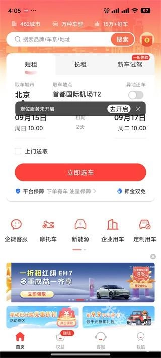 用户选定取车的城市、地点与时间后,还能选择上门送取服务,之后点击“立即选车”即可。