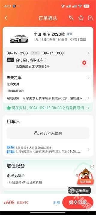 补充完用车人的相关信息后,确认订单内容没有问题,点击提交订单按钮就可以了。