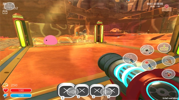 进入游戏后,左侧区域用于操控角色移动,右侧的按键功能依次为发射史莱姆、吸收史莱姆、放下物品、拾取物品和跳跃。
