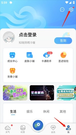 首先在本站安装墨迹天气国际版,打开后进入“我的”页面,接着点击右上角的设置图标。