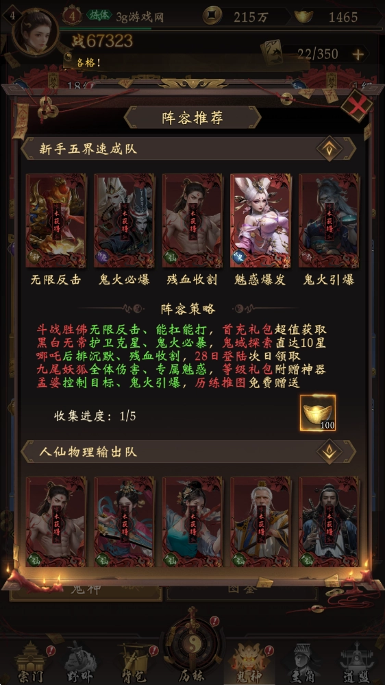 阵容搭配策略如下:斗战胜佛具备无限反击能力,既能承受伤害又能输出,首充礼包即可超值获取;黑白无常是护卫职业的克星,释放鬼火技能必定暴击,助力鬼域探索轻松直达10星;哪吒可对后排敌人施加沉默效果,还能完成残血收割,28日登录后次日就能领取;九尾妖狐拥有全体伤害技能,还有专属魅惑效果,等级礼包会附赠其专属神器;孟婆能够控制目标,还能引爆鬼火,通过历练推图即可免费获得。