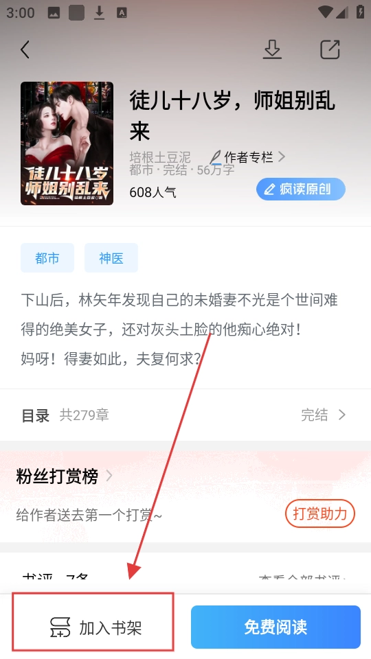 进入小说详情页后,点击【加入书架】按钮,就能把这本小说收藏好,这样以后想再看的时候就方便多啦。