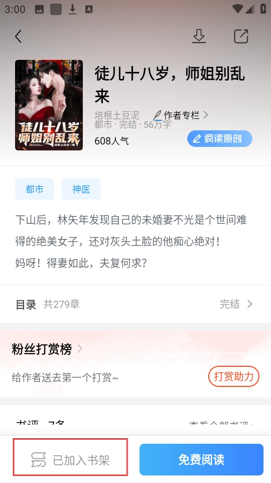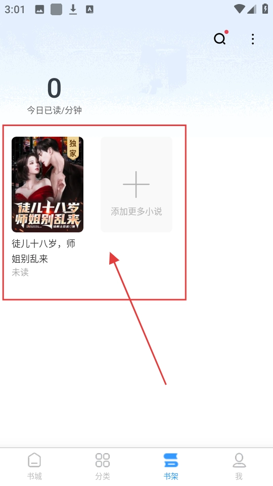 回到书架页面,就能看到刚添加的《徒儿十八岁,师姐别乱来》,随时都能阅读啦。