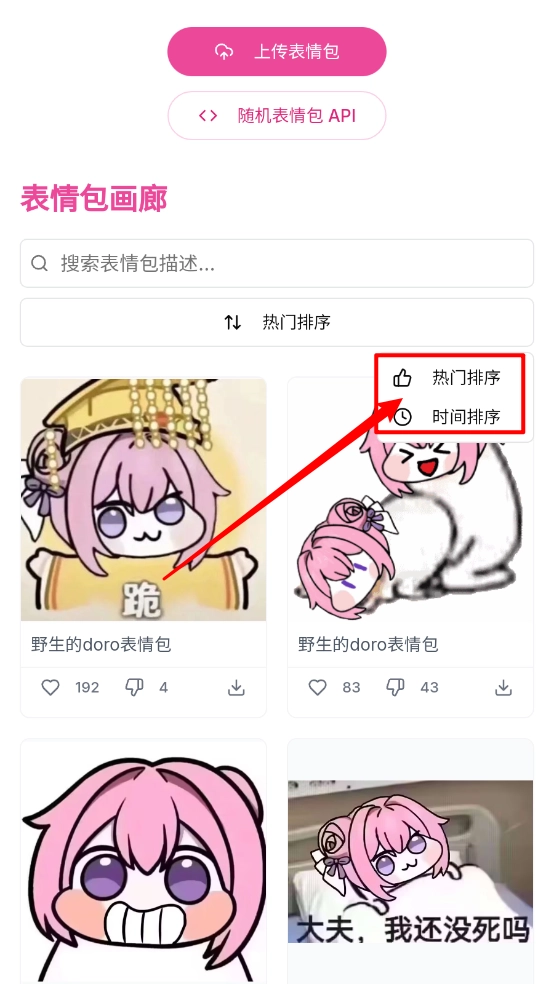 如图所示,我们可以按照热门程度或时间先后对表情包进行排序搜索。