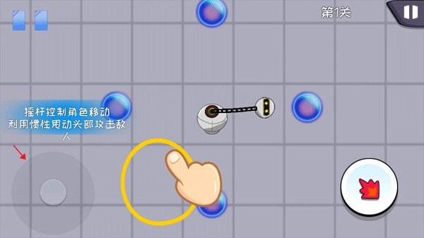这款游戏有两种玩法,先来说第一种:玩家需要借助摇杆操控角色移动,同时利用惯性甩动角色头部去攻击敌人,等把场景里的四个敌人都用头部攻击消灭后,就能顺利进入下一关了。