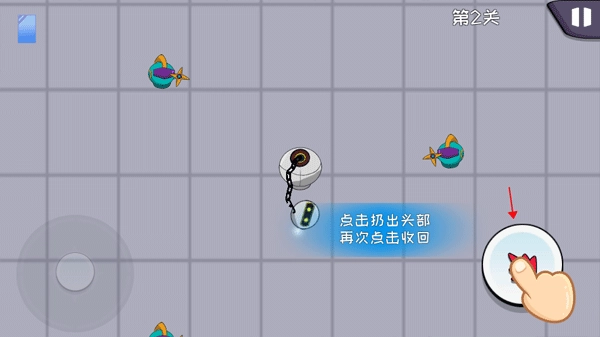 游戏的第二种玩法是:点击右侧按钮,把头部扔出去,借助惯性攻击敌人;要是想收回扔出去的头部,只需再次点击右侧按钮,头部就能回到身体上。