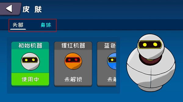 机器人的皮肤涵盖其头部与身体部分,部分皮肤需持续通关对应关卡方可解锁,并且不同类型的皮肤具备的伤害抵御能力存在差异。