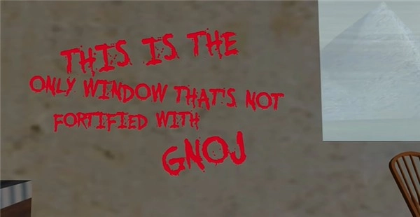 镜头切换到室内场景,墙上的提示明确要求我们打破旁边的窗户。