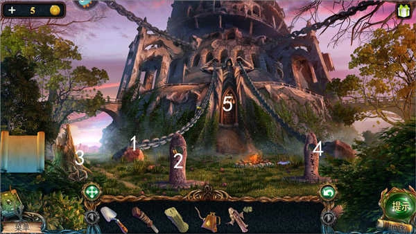 用镰刀割掉一处杂草,就能露出第五尊和尚雕塑;在另一处找到钥匙后,用铲子挖开松软的泥土,就能挖出音乐盒的鼓部件。