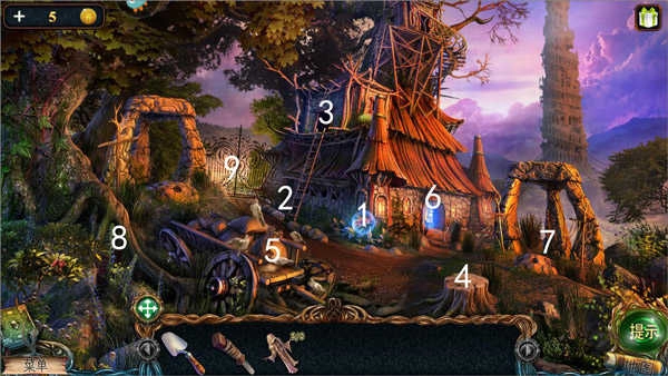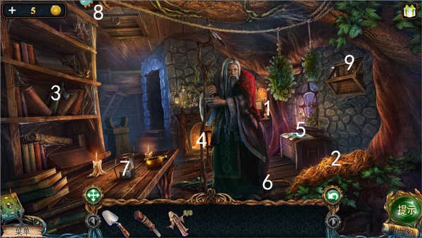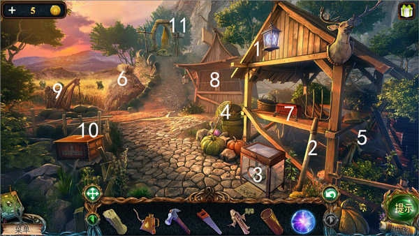 农具间里,在1号位置捡到了第二个能量球;2号位置拿到大叉,这个工具能用来扎破6号位置的干草堆,从中找到第六块和尚雕塑;3号位置的书籍里有关于“哈芬斯”的线索;4号位置可以得到捕虫网;5号位置能发现第七块和尚雕塑。