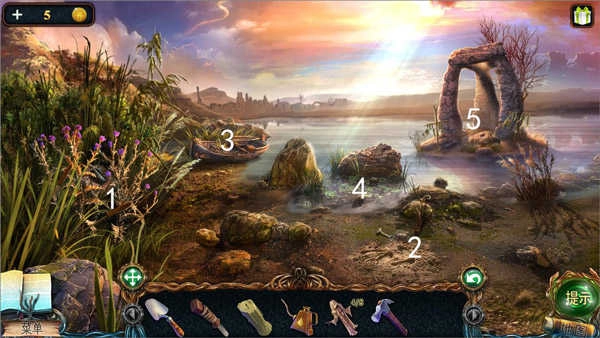 点击3号位置的小船,到1号位置拾取龙形塑像,从2号位置拿到钥匙,完成4号位置的拼图小游戏后获取剪刀;用剪刀剪断5号位置的藤蔓,就能得到天使雕塑。